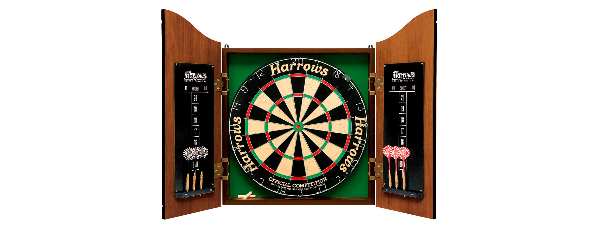 The complete "ready to go" steeltip combination set is presented in a superb, high impact, full colour carton. Consists of a Rosewood finish cabinet (with 2 scoreboards), Official Competition Bristle Dartboard, Two sets (6 Pieces) of quality darts, Chalks & Duster.